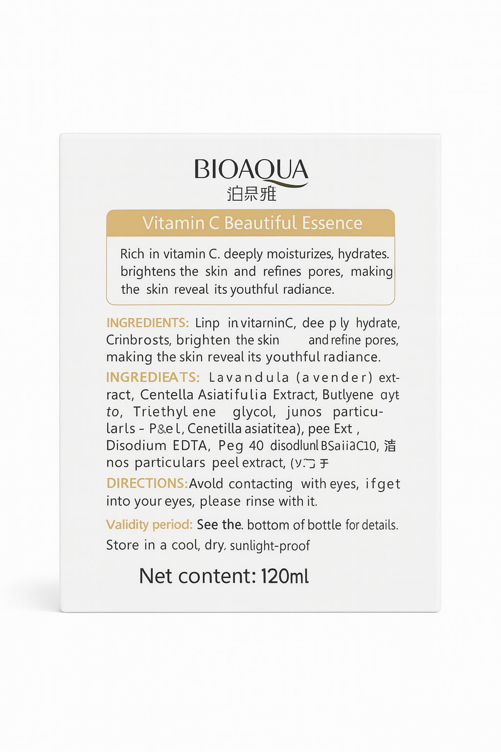 Vitamin C Beautiful Essence Water BIOAQUA (120 ml) ofrece una hidratación profunda que revitaliza la piel, dejándola fresca y con una textura mejorada. Este producto repara y unifica el tono, ayudando a restaurar la piel seca, áspera y apagada, para una apariencia más suave y luminosa.