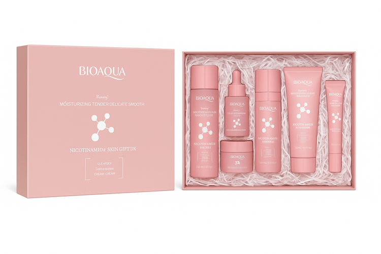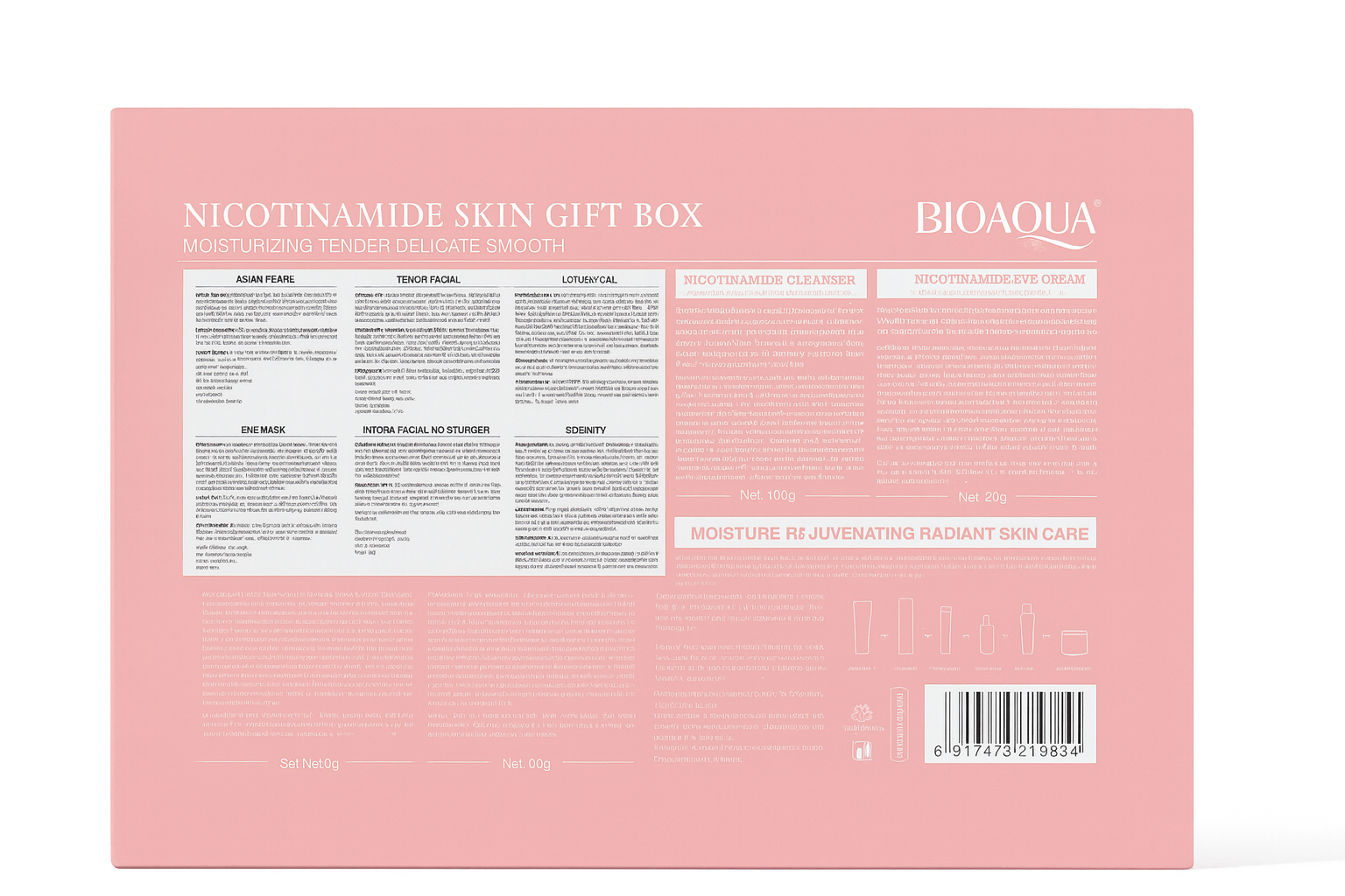 El Bioaqua Nicotinamide Skin Gift Box es un set completo de cuidado facial formulado con niacinamida, un ingrediente reconocido por su capacidad para hidratar, suavizar y mejorar la luminosidad de la piel. Esta rutina combina seis productos diseñados para brindar un tratamiento facial integral, favoreciendo una piel suave, tersa y con un aspecto saludable y radiante.